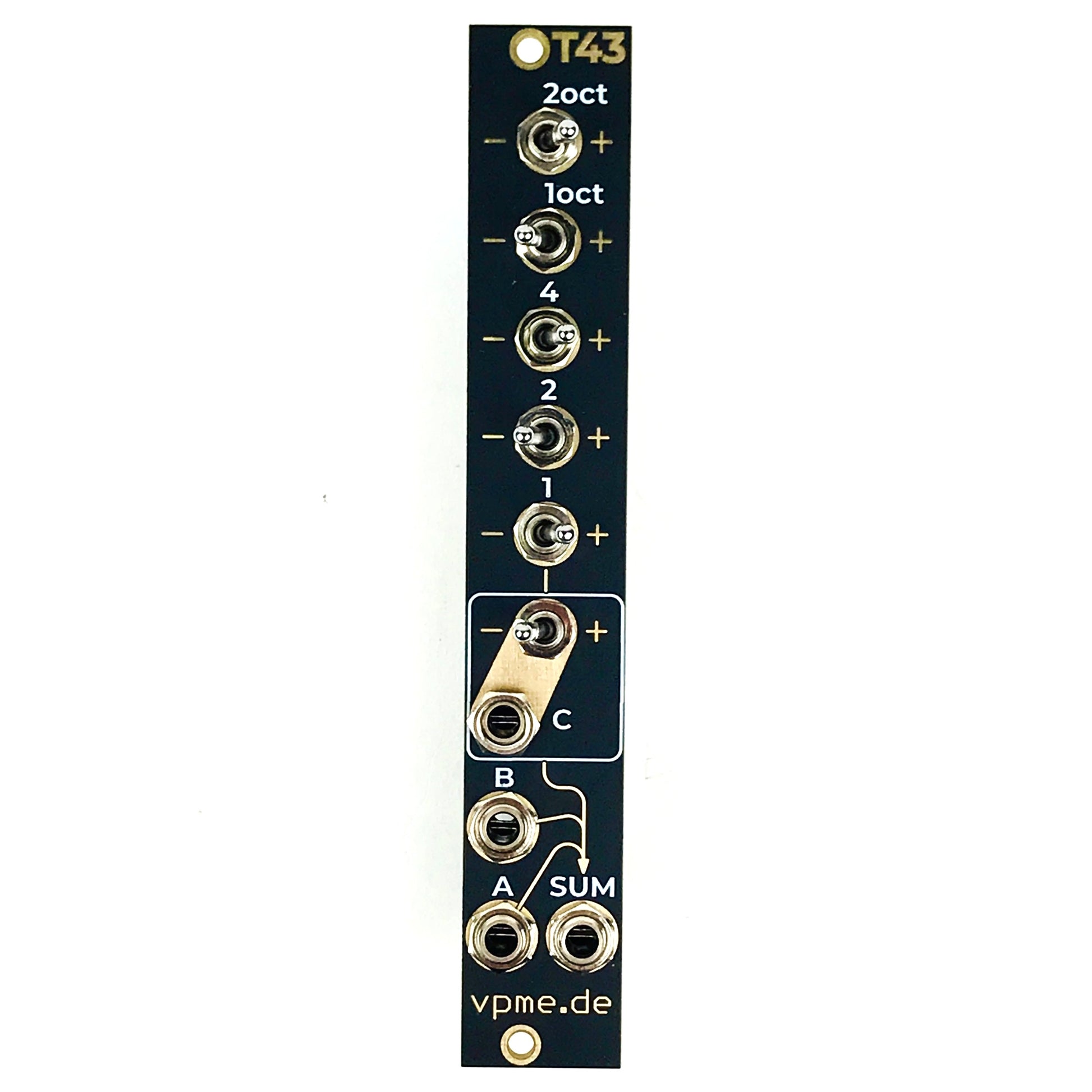vpme.de's T43 is a precision adder and transposer that uses precision opamps and voltage references in order to give you perfect tuning across the whole transposition range. This module is perfect for adding semitones and octaves to a Pitch CV with the flick of a switch.