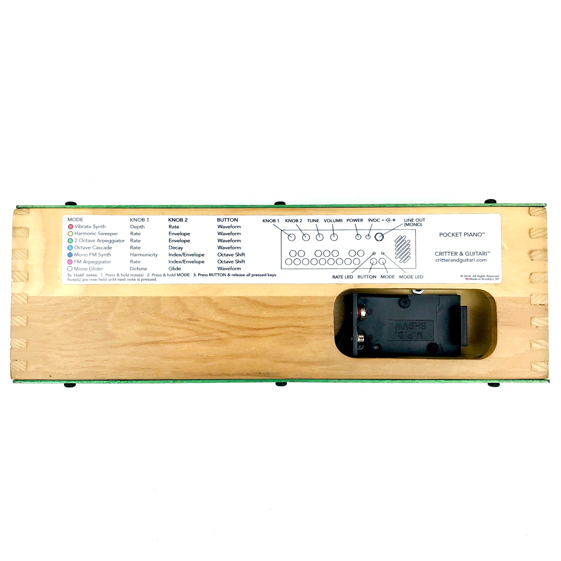 Pocket Piano runs on 9v Positive Center power adapter (sold separately), or 9v battery (not included).