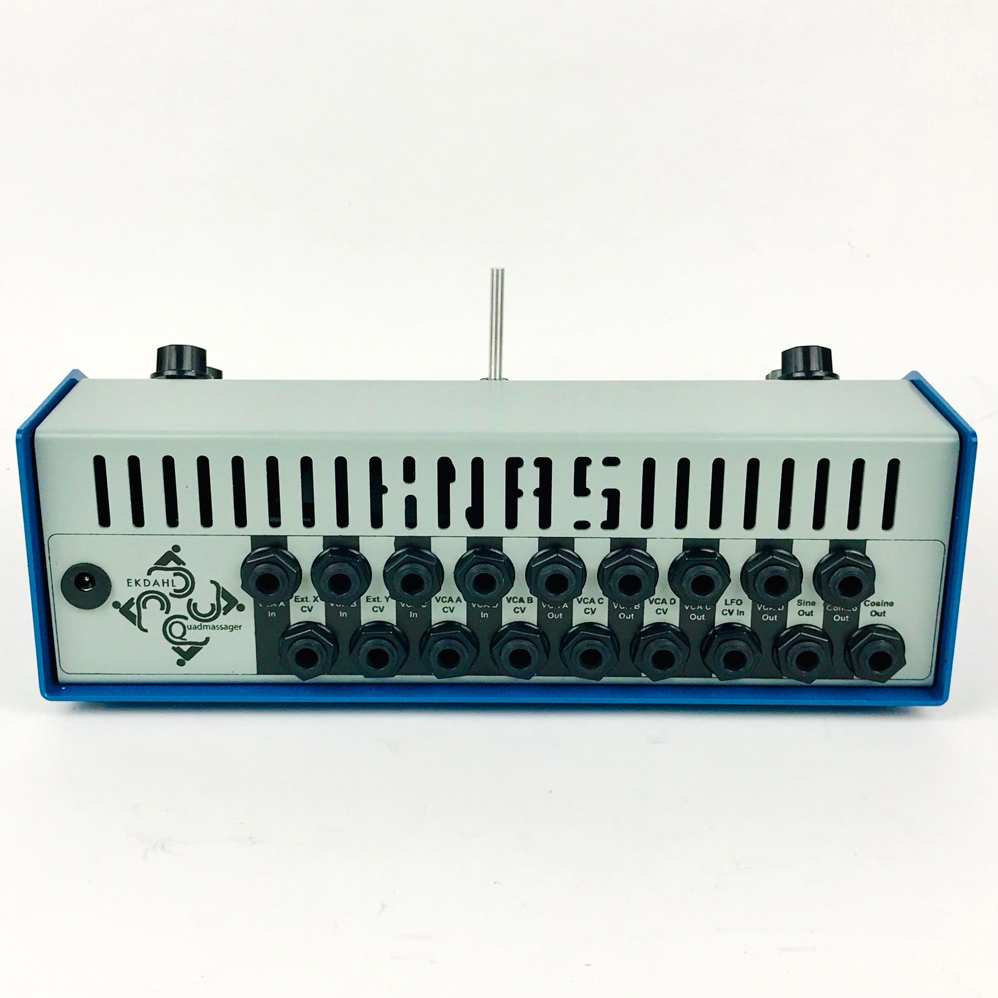 Each output is controlled by a VCA, each VCA has one signal input, one signal output and one CV input. If connected, the direct CV input breaks the connection to the joystick and LFO routing so that the VCA can be used as stand-alone. The Ekdahl Quad Massager also has CV inputs for both the X and Y axis, serving the same function as the joystick movements.